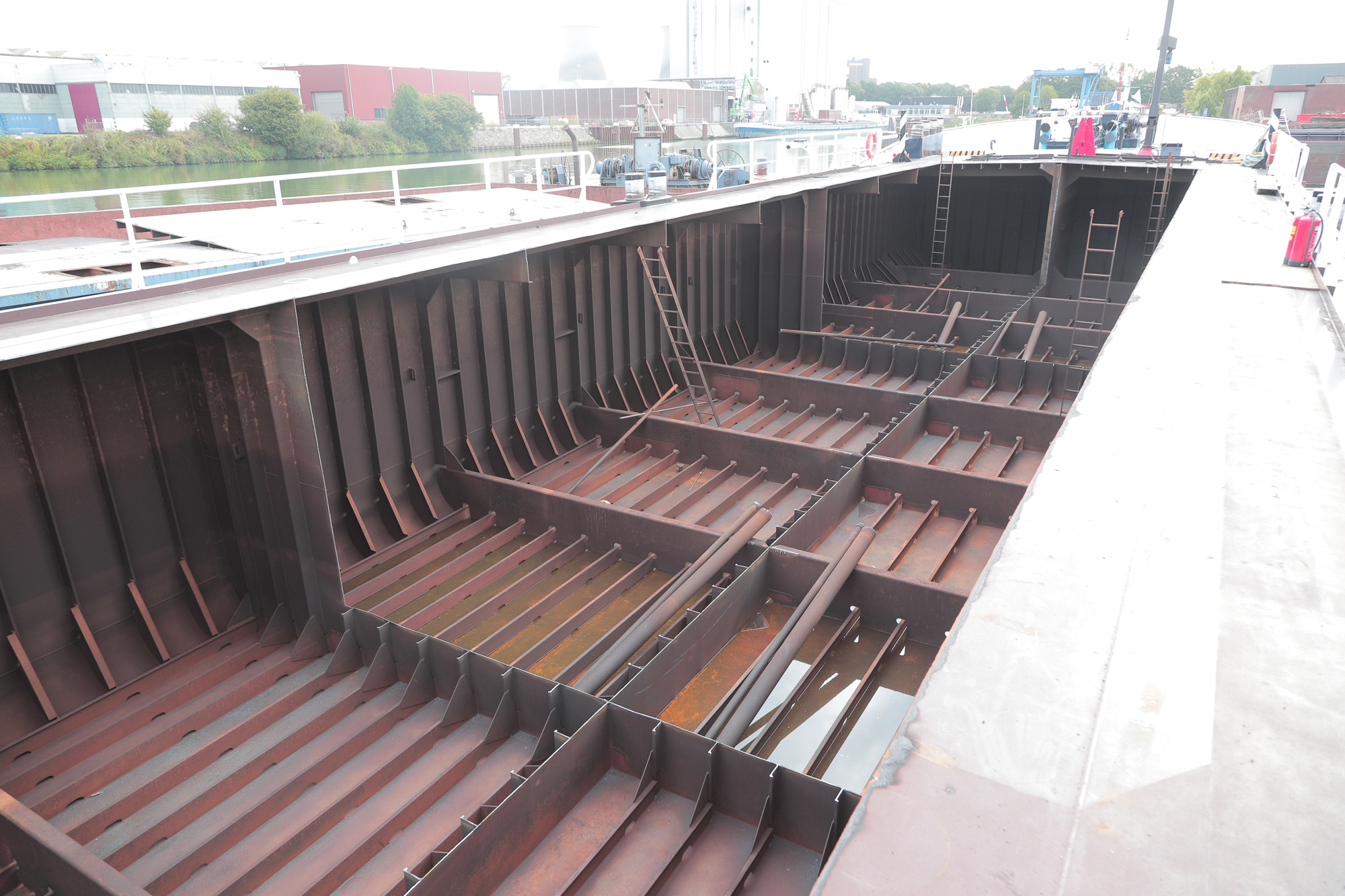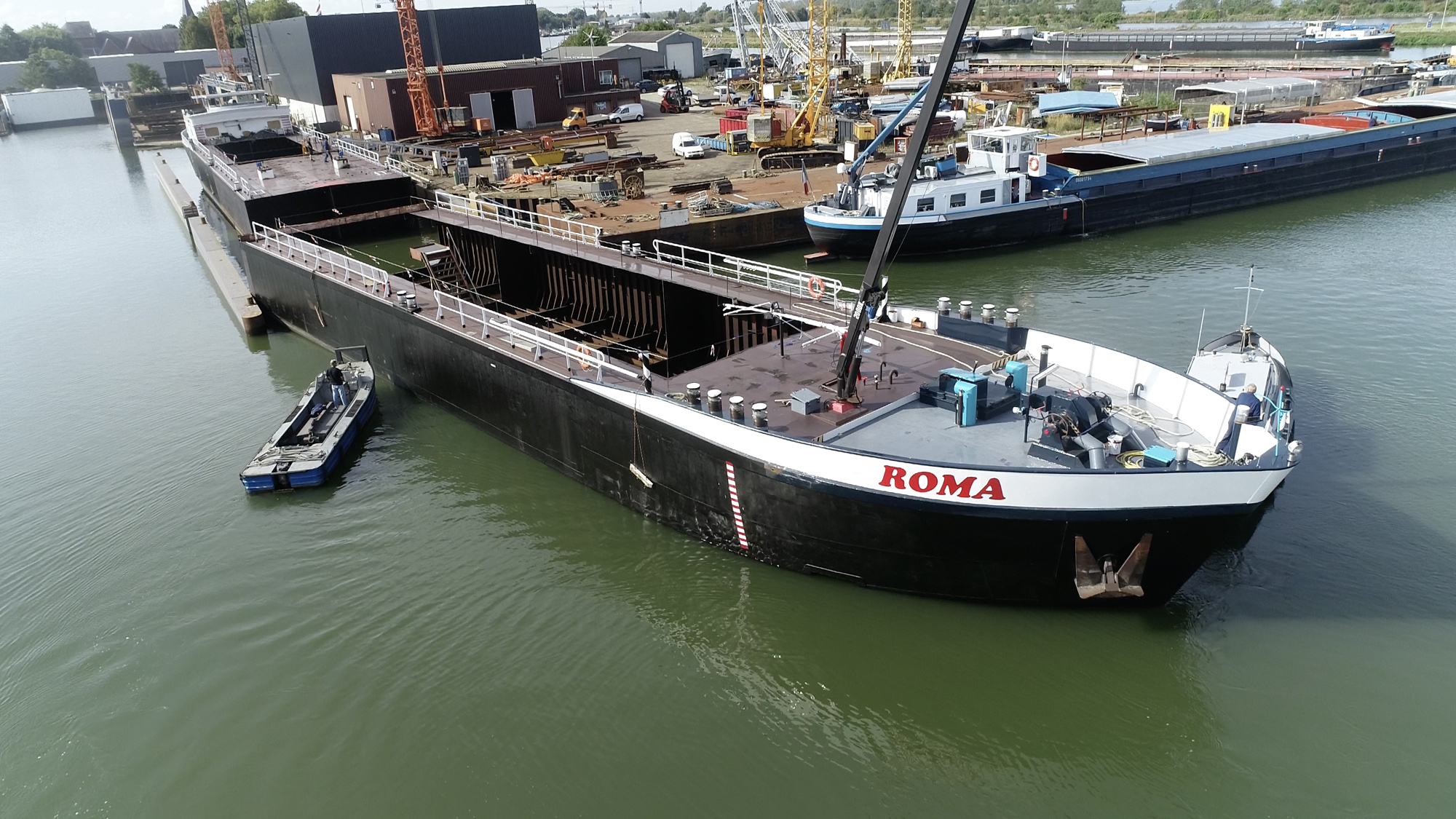 De enkelwandige tanker de Roma werd bij ons omgebouwd tot beunschip.