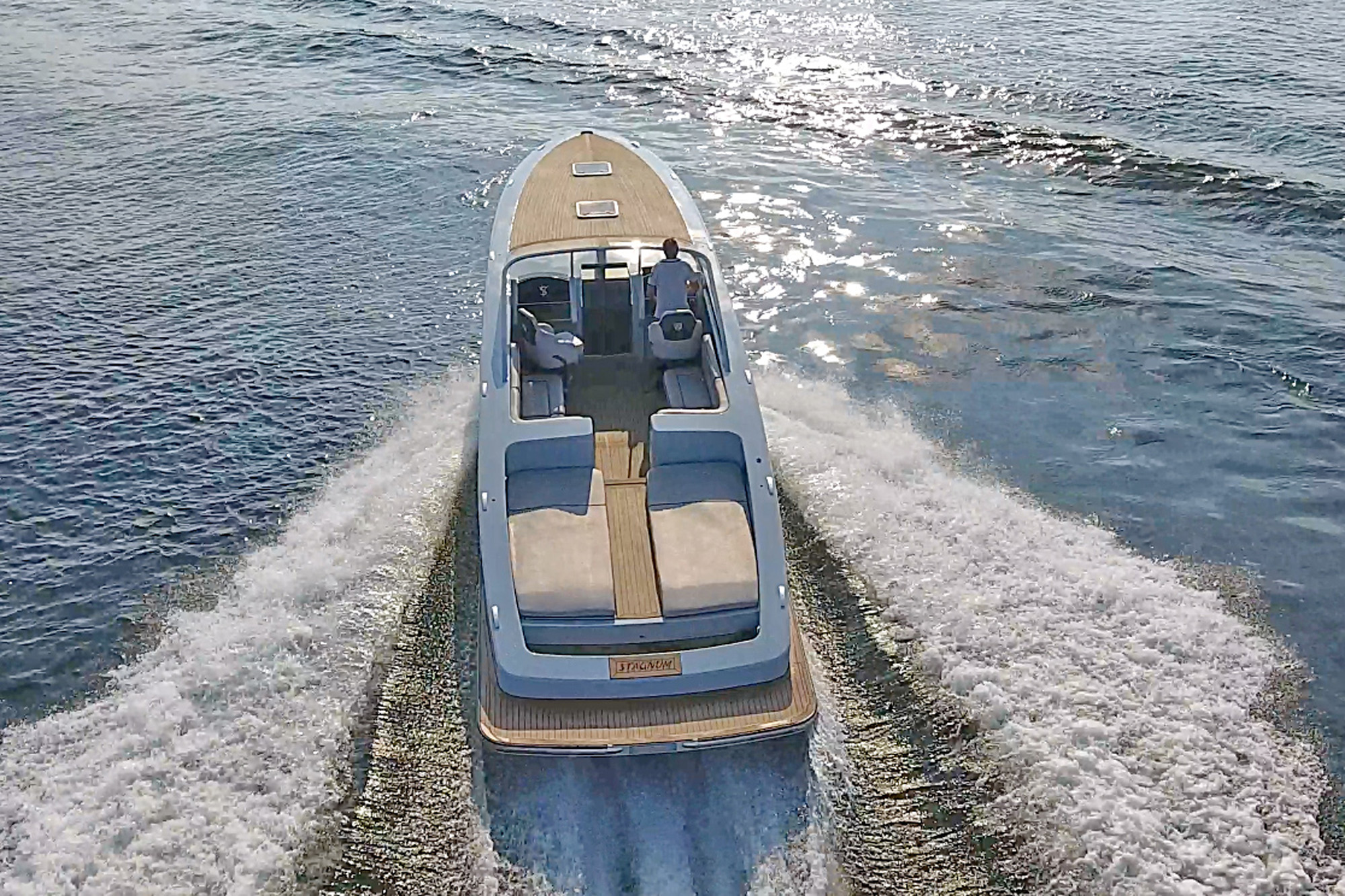 Grijs, dus niet te veel opvallend, maar met lijnen die snelheid en zeewaardigheid verraden. Het model is dat van een zogenaamde Runabout, een boot die vroeger vaak werd gebruikt door smokkelaars. Kenmerkend zijn het enorme voordek, de schuin geplaatste voorruit en het al even grote zonnedek achterop. Maar niet alleen de buitenkant is imposant.